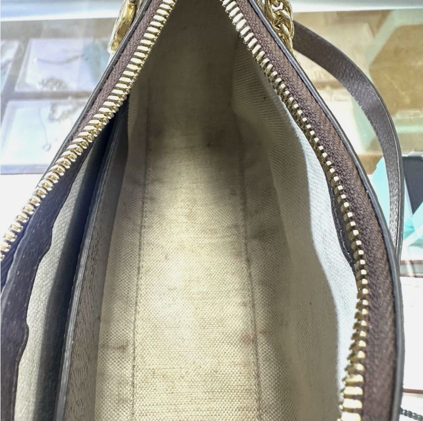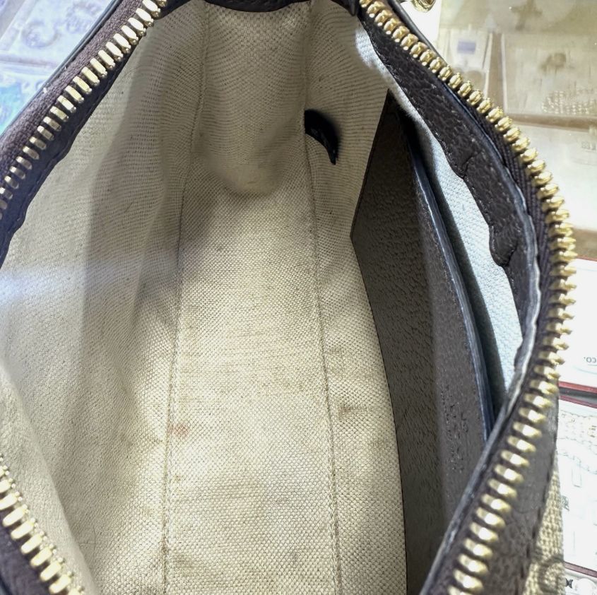 Condition: “Preowned very good - Overall 7.5/10. Outer material is clean with light wear. Front corner piping has light rub wear. (pictured) minor but visible under close inspection. Hardware looks clean, with only visible wear being on tips of removable strap (pictured) inner material has some minor soiling and a small pink stain. (pictured) No Odor.”
